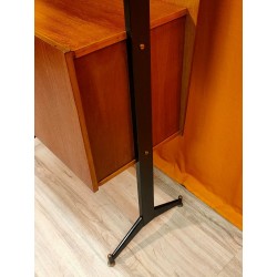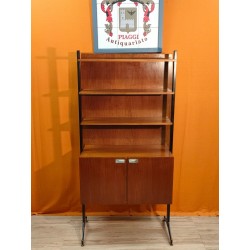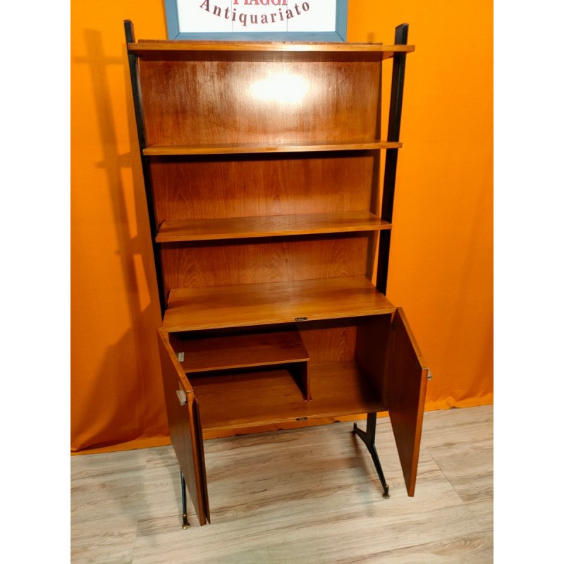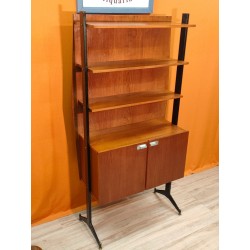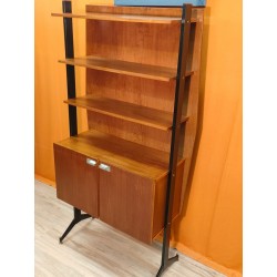 Particolare mobile libreria vintage anni60 impiallicciato in teck ,provenienza Lombardia .La Liberia e composta da 3 ripiani fissi con mobiletto a 2 ante anch'esso fisso , schienale molto robusto in modo da uniformare e rendere più forte la struttura ,sorretti da 2 montanti di ferro con piedini in ottone regolabili, maniglie in acciaio tipiche dello stile scandinavo ,chiusura antine con calamita